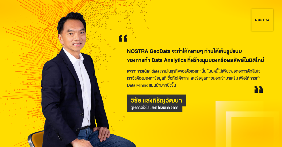 NOSTRA GeoData จะทำให้หลายๆ ท่านได้เห็นรูปแบบของการทำ Data Analytics ที่สร้างมุมมองหรือผลลัพธ์ในมิติใหม่ เพราะการใช้แค่ Data ภายในธุรกิจของตัวเองเท่านั้นในยุคนี้ ไม่เพียงพอต่อการตัดสินใจ
